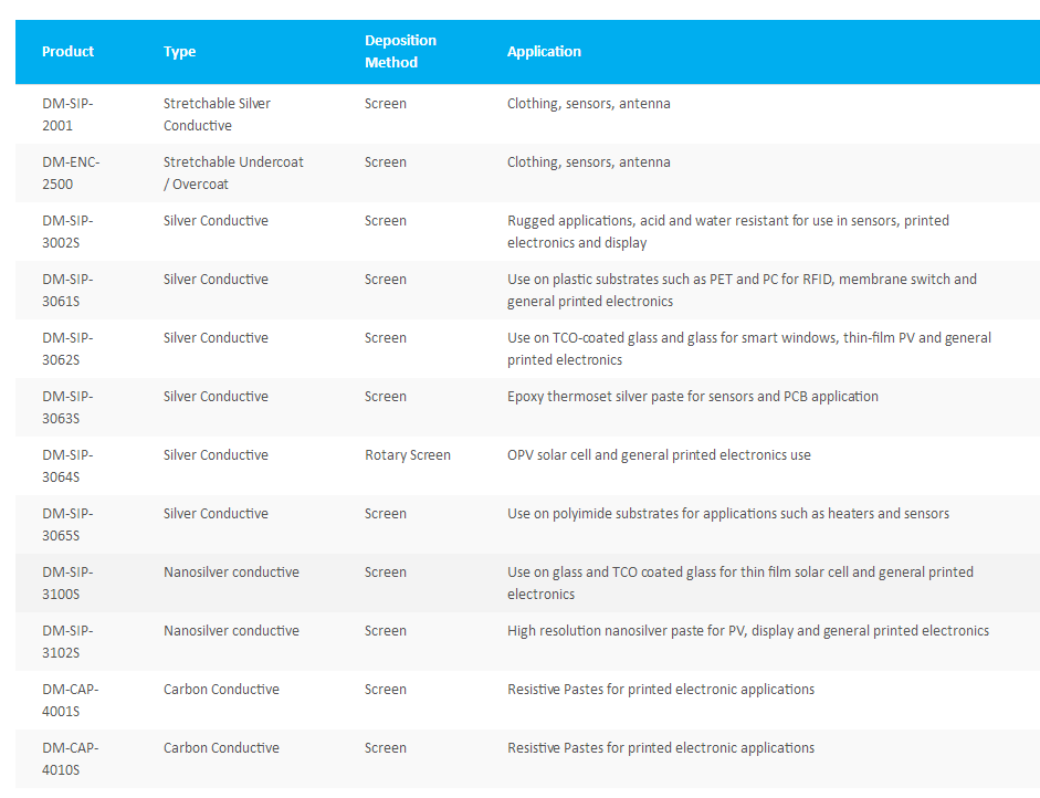We offer a range of advanced silver, carbon and coppermaterials including conductive, insulator, assembly andovercoat inks, for electronics and clean technology applications. Global supply of low volume samples through to high volume material production is available.