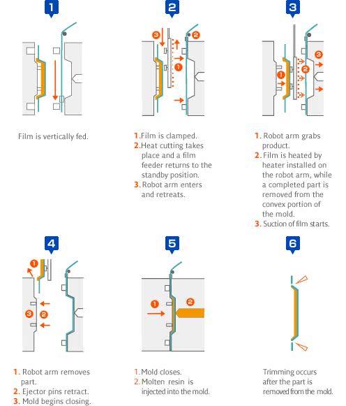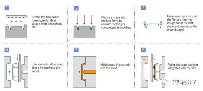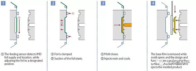 (5) 薄膜与塑胶材料注塑成为零件。IME 产品既具有模内装饰工艺的美观与环保,又一体成型实现了功能与结构装饰的无缝结合,因此被广泛应用于汽车、飞机及家电领域。